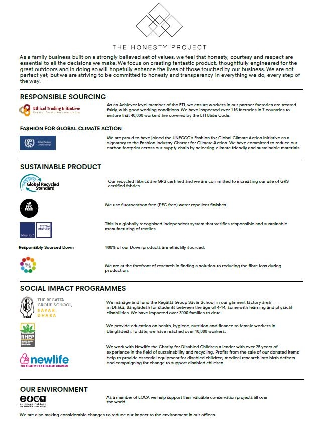 De jassen zijn gemaakt van 100% gerecycled polyester, geproduceerd uit minimaal 15 PET-flessen en zijn PFC vrij. Er is dus geen gebruik gemaakt van schadelijke en milieu-onvriendelijke stoffen om de jassen waterdicht te maken. Daarnaast garandeert de producent, als actief lid van de ETI (Ethical Trading Initiative), dat werknemers die de jassen produceren op een eerlijke manier worden behandeld en in goede omstandigheden kunnen werken.